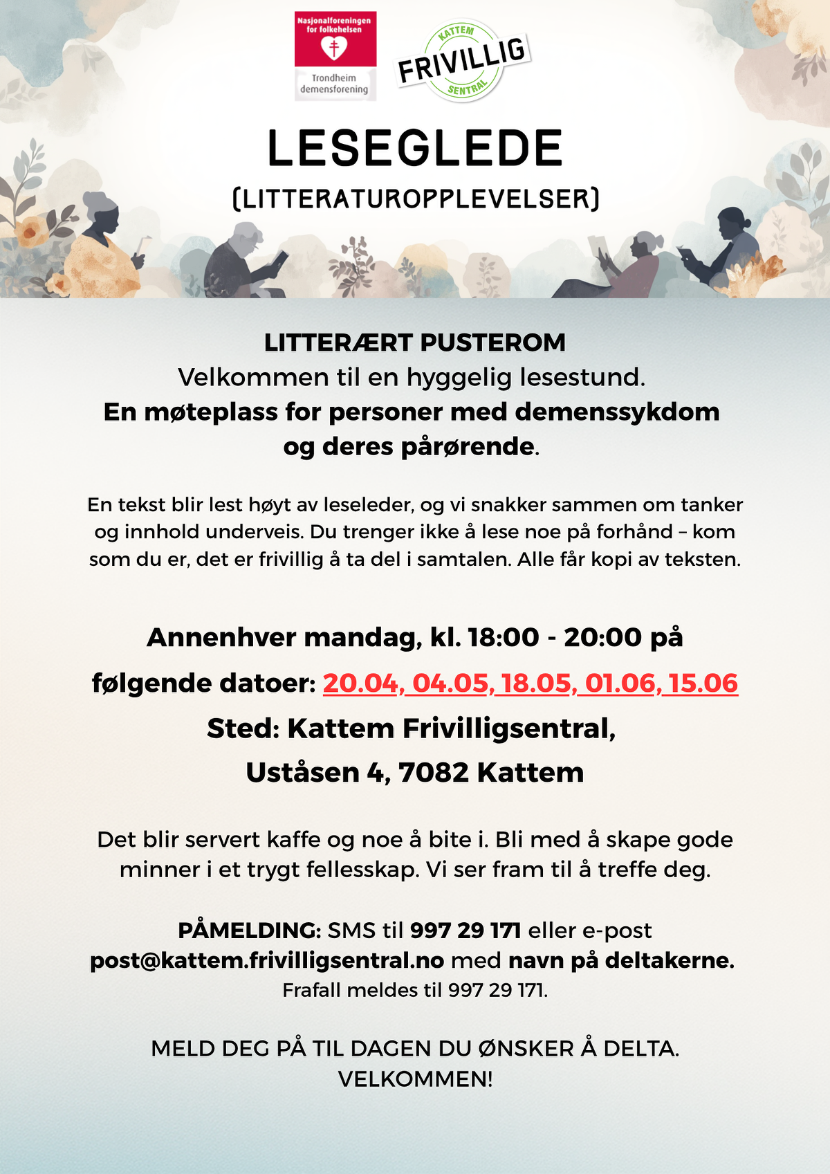 SMS til 997 29 171 eller post@kattem.frivilligsentral.no med antall og navn på deltakerne.